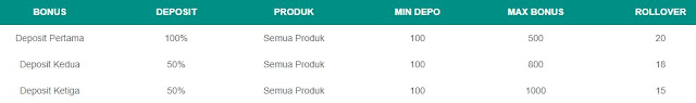 3. Untuk memenuhi persyaratan, Anggota harus melakukan deposit pertama minimal sebesar IDR 100 atau lebih dan mentransfer dana ke dompet Sporbook, Slot ataupun Kasino Live, Setiap bonus hanya bisa diklaim satu kali untuk satu anggota, apabila anggota sudah menyelesaikan semua ketentuan rollover, anggota bisa mendapatkan bonus berikutnya untuk bonus deposit kedua dan ketiga.